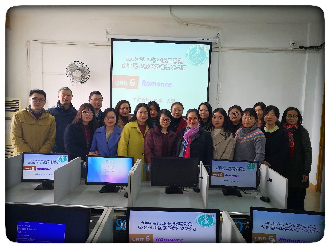 2019年3月6日下午,人文医学银河 外语系2018级本科教学组进行了本学期大学英语第六单元集体备课。集体备课会是外语系的常态化会议,全体教师每两周开展一次教学研讨活动。根据2018级教学组备课安排,同一单元由两位老师分别主讲备课,交流分享个人教学思路、教学活动设计及补充的教学材料,教学组所有老师积极讨论,相互借鉴,汇集集体智慧,共同提高教学水平。