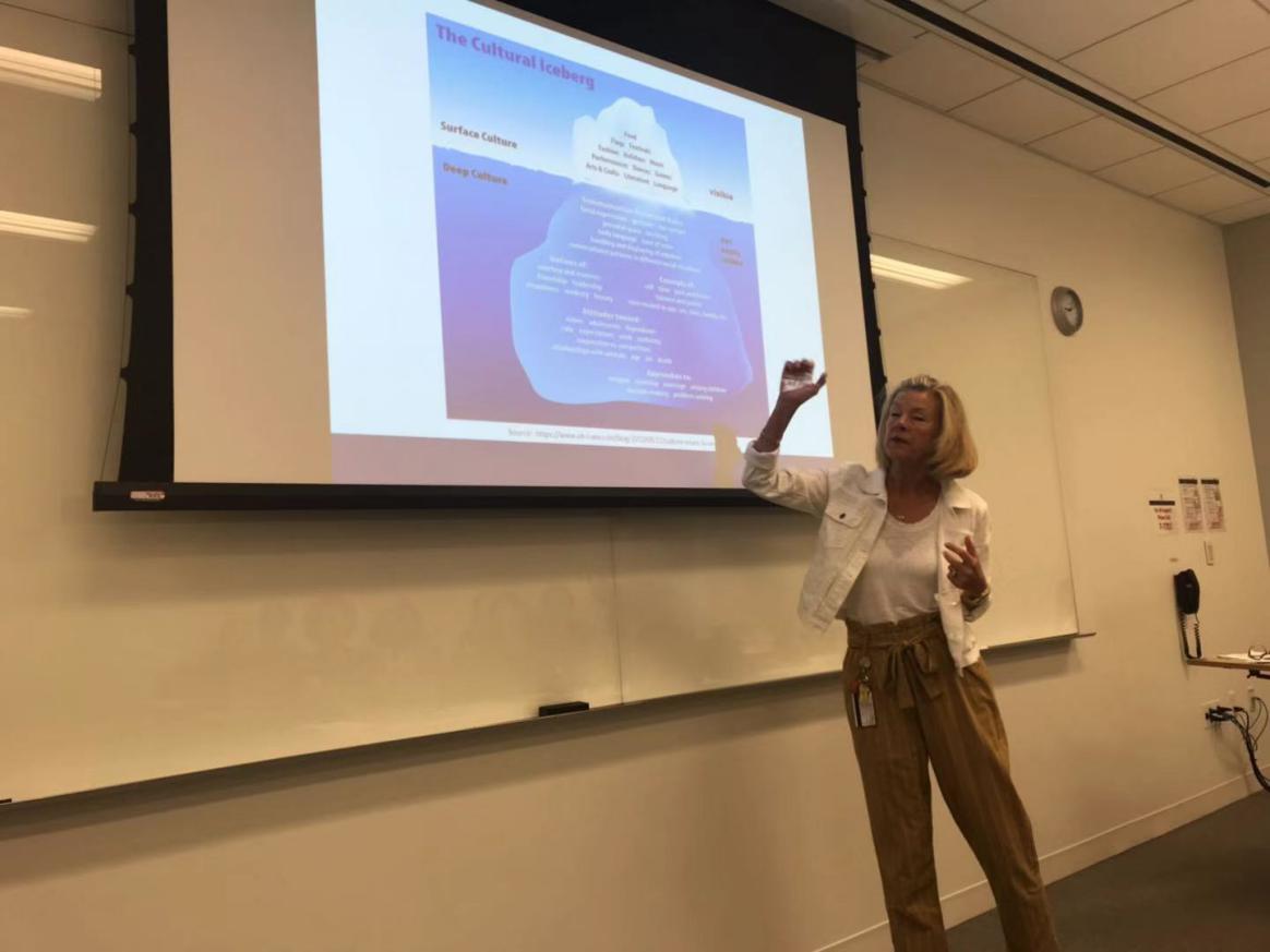 Dr. Sigrun 教授从文化和跨文化交际技能的定义、东西方基本文化特征八个方面对比、言语交际差异、书面语交际差异、非言语交际差异、跨文化交际障碍等方面对跨文化交际做了深入的阐释和总结。在讲解言语交际差异时,Dr.Sigrun课程教授得生动形象,妙趣横生,巧妙地运用了各种比喻,例如,用保龄球、篮球和橄榄球三种球类生动形象地比喻交流者言语对话的风格和次序;把跨文化交际能力比作是一座漂浮在水面上的冰山,不仅需要了解冰山在表层的可见的文化差异,更需要挖掘表层背后隐含的不可见差异,如交流的风格和规则、观念、态度、思维方式等等,从而达到有效的交流。当今全球化趋势,不可避免会发生跨文化交际。《大学英语教学指南》指出,“大学英语的教学目标是培养学生的英语运用能力,增强跨文化交际意识和交际能力.....”。学生的跨文化交际能力培养越来越受到重视,相关的独立的跨文化交际教材也相继出炉,Dr.Sigrun 的课程为我们以后的教学中融入跨文化交际意识和交际能力培养提供了更多的方向、内容和方法。