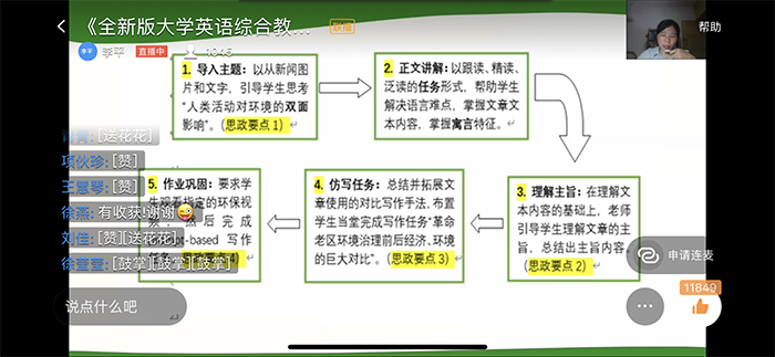 活动中,我系教师李平结合授课单元,从“思政主题的选择与确立”“思政元素的挖掘与融入”“教学环节的设计安排”等方面,全面展示了银河 大学英语“课程思政”的教学经验。此前我系教师孙娟也受邀参加活动并作了教学设计的分享。两位老师直播示范课各具特色,在语言学习的过程中巧妙融入思政元素,增加了思政内容的感染力和亲和力。两场直播课观看人数均超过千人次,获得全国英语教师同行的一致好评。