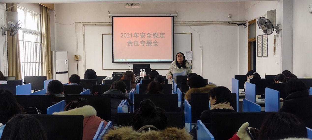 外语系召开安全稳定责任专题会 发布时间:2021-01-21 浏览次数:958 2021年1月20日外语系全体教职员工在五楼第五语音室召开了2021年安全稳定责任专题会。外语系主任就安全稳定的重要性、覆盖范畴、各项规章制度和具体落实进行了详细的解释,要求每位教职员工必须把安全稳定工作牢记心头, 明确自己的安全责任,确保安全稳定工作扎实开展和实施,确保安全稳定工作做到万无一失。
