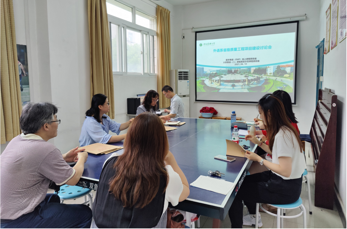 2021年6月10日上午,外语系在人文医学银河 三楼活动室组织2020年度省级质量工程立项项目建设讨论会。医学英语(EMP)线上课程项目组和大学英语(二)课程思政示范课程项目组成员参加会议讨论。