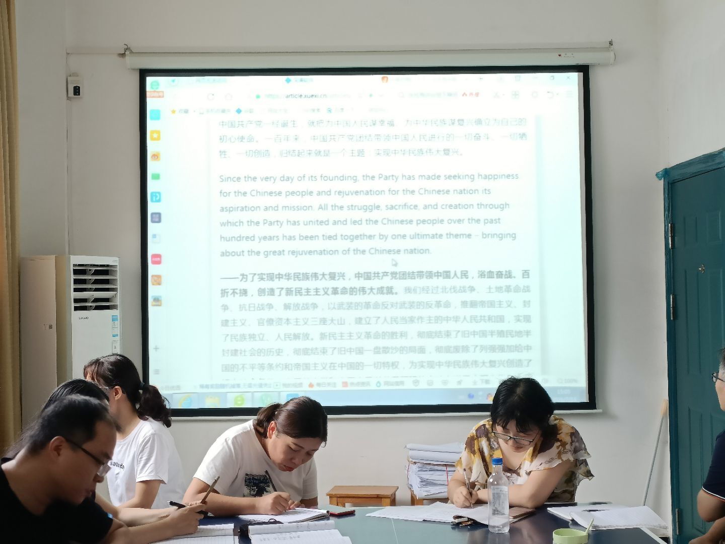 2021年7月13日下午,外语党支部在三楼党员活动室集中学习建党100周年习近平总书记七一讲话。结合外语专业,本次学习采取了中英文对照版本,不仅学习了七一重要讲话精神,同时也学习了专业时政英语,讲话英文版本也为课程思政教学提供了大量的素材和资源。
