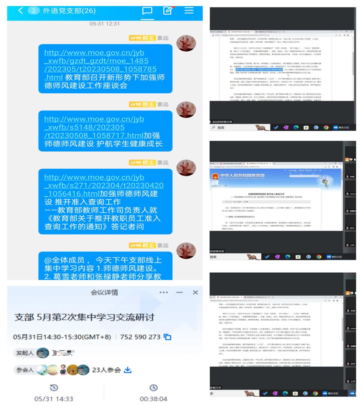 外语党支部531日周三下午召集全体党员线上集中专题学习师德师风。会上,支部书记带领大家集体学习了教育部56日召开的新形势下加强师德师风建设工作座谈会的会议精神,坚持对师德违规行为“零容忍”,努力成为高素质专业化创新型教师。同时学习了《人民日报》专题文章《加强师德师风建设 护航学生健康成长》,引导党员教师继承发扬“捧着一颗心来,不带半根草去”的精神,以赤诚之心、奉献之心、仁爱之心投身教育事业,护航青少年健康成长。最后,集体学习了教育部教师工作司负责人就《教育部关于推开教职员工准入查询工作的通知》答记者问,了解《通知》出台的背景、意义以及主要内容,严把教师队伍入口关,加强师德师风建设。