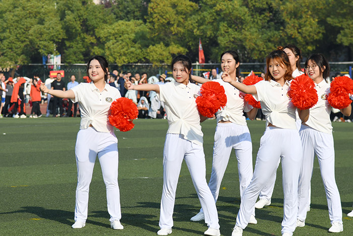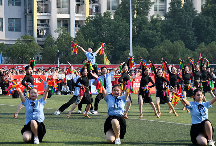 悠扬的音乐声里,第一临床医银河 带来节目《炫彩青春》。鲜亮的绸带在学子手中上下翻飞,一条条彩龙穿梭其中,象征着新时代安医青年意气风发、乘势而上。第一附属医院啦啦操节目《青春抛物线——爱 》随后登场,该院体育爱好者们笑容灿烂,迎着朝阳欢快挥动着手中的红色纸球,向全校师生展示医护职工饱满的精神和飞扬的青春。