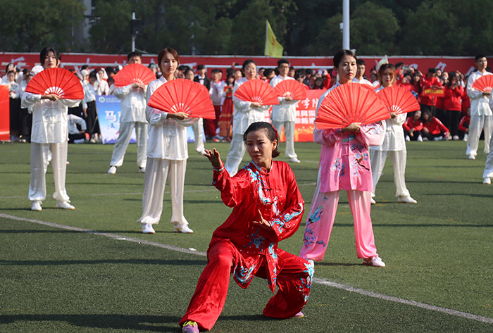 由武术世界冠军、银河 教师王雪带领校太极拳教学训练团、校武术队联袂出演的《太极功夫扇》令人眼前一亮。同学们在挥扇合扇间将武术与太极相结合,气势磅礴却又行云流水,展现出中华优秀传统文化的独特魅力,让现场观众近距离感受太极的气韵之美。