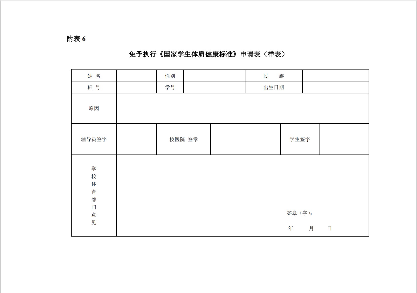 免予执行《国家学生体质健康标准》申请表(样表) 发布时间:2022-11-30 浏览次数:121 对于由于某种特殊情况,无法按《国家学生体质健康标准》执行体质健康测试的学生,请下载并填写此。202211301013418266.doc