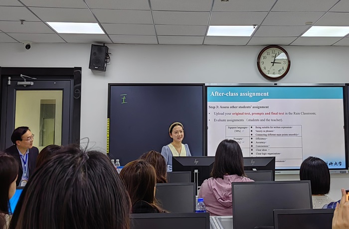 青年教师杨顺利选取课程中的具体单元进行教学展示。她基于外语教学中的产出导向法,分驱动、促成、评价三个阶段设计教学活动,以“饮料与健康”的医学科普为情境,指导学生如何使用衔接性语言完善医学科普演讲,并将人工智能辅助英语学习融入教学环节,引导学生科学合理地利用相关工具进行英文演讲、写作文稿的修改润色和评价反馈,以有效提升语言能力、思辨能力、创新能力和合作能力。