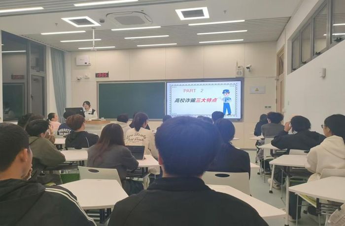 随后,刘思函同学就如何识别诈骗的问题做了详细的介绍。她通过上当受骗的三个典型案例引出高校诈骗具有智能型,多样性和目标选择性三大特点,列举了高校诈骗的五大形式,并根据诈骗五大形式针对性的提出预防诈骗的方法。环环相扣的介绍帮助大家提高预防诈骗的意识,也为大家提供预防和识别诈骗的方法。