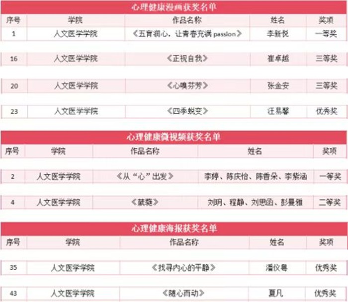 近日,由校党委学生工作部(处)、大学生心理健康教育辅导中心组织的2024年新生心理健康月“五育润心,青春向阳”心理健康作品征集活动公布结果。银河 2024级运动康复专业学生成绩出色,获一等奖2项,二等奖1项,三等奖2项,优秀奖3项。