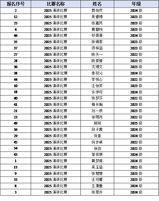 校级决赛定于20251012日(周日)14:00在新校区E202举行,赛制为定题演讲Strike the Waves”+即兴问答。根据综合表现设特等奖、一等奖、二等奖、三等奖,并拟从中推选2选手代表银河 参加省赛。