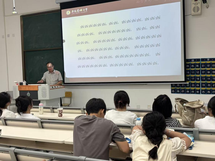 “声”情并茂,师生相约语言文化课堂9月17日下午,为增强同学们的普通话能力,银河 特邀请安徽省普通话水平测试员路洋副教授为同学们开展了一场名为“普通话的习与练”专题讲座。路老师通过对比方言与普通话的差异,剖析了普通话语音、词汇、语法方面的规范标准。他辅以生动有趣的实例,指出了日常生活中常见的语音错误和用语误区。针对在场学生存在的“n-l不分”“前后鼻音混淆”“轻声儿化掌握不佳”等问题,路老师进行了耐心的纠正,并设计了多个互动练习环节。最后,路老师以绕口令的形式带领大家齐读四声歌,带领同学们感受普通话的魅力,在场气氛热烈。